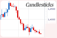 Dit is veruit de meest gebruikte manier van prijzen plotten tegenwoordig. De methode is uitgevonden door Japanse rijst handelaren in de zeventiende eeuw, dus zo jong is deze methode helemaal niet. :) In het volgende artikel besteden we meer aandacht aan de candlestick, maar hieronder alvast een voorbeeld. Het mooie aan de candlestick is dat hij perfect weergeeft wat er binnen een bepaalde periode met de prijs is gebeurd. Bovendien zijn er allerlei soort candles - doji candle, long-legged doji candle, gravestone doji etc- en patronen -harami, hammer, dark cloud cover, three black crows, three white soldiersetc- die veel waarde hebben bij het voorspellen van toekomstig marktsentiment. Een ding is zeker: Als je een succesvol trader wilt worden moet je leren deze patronen te herkennen.. Kan je een hoop opleveren.....oh enne, blue / green be good, red be bad!