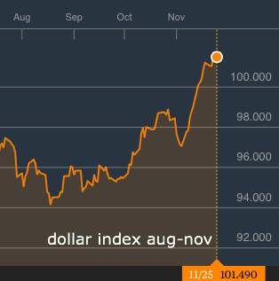 Aan het begin van de maandag daalde de dollar index -- een gewogen gemiddelde van de dollar tegenover de zes belangrijkste andere valuta -- in korte tijd van 101,49 tot 101,13.