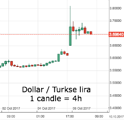 De Turkse lira wist maandag op de forex wat te stabiliseren van de gevolgen van de diplomatieke rel tussen de VS en Turkije. De lira pakte ongeveer de helft van het zondag/maandagochtend verloren terrein terug en de volatiliteit in het valutapaar USD/TRY nam wat af.